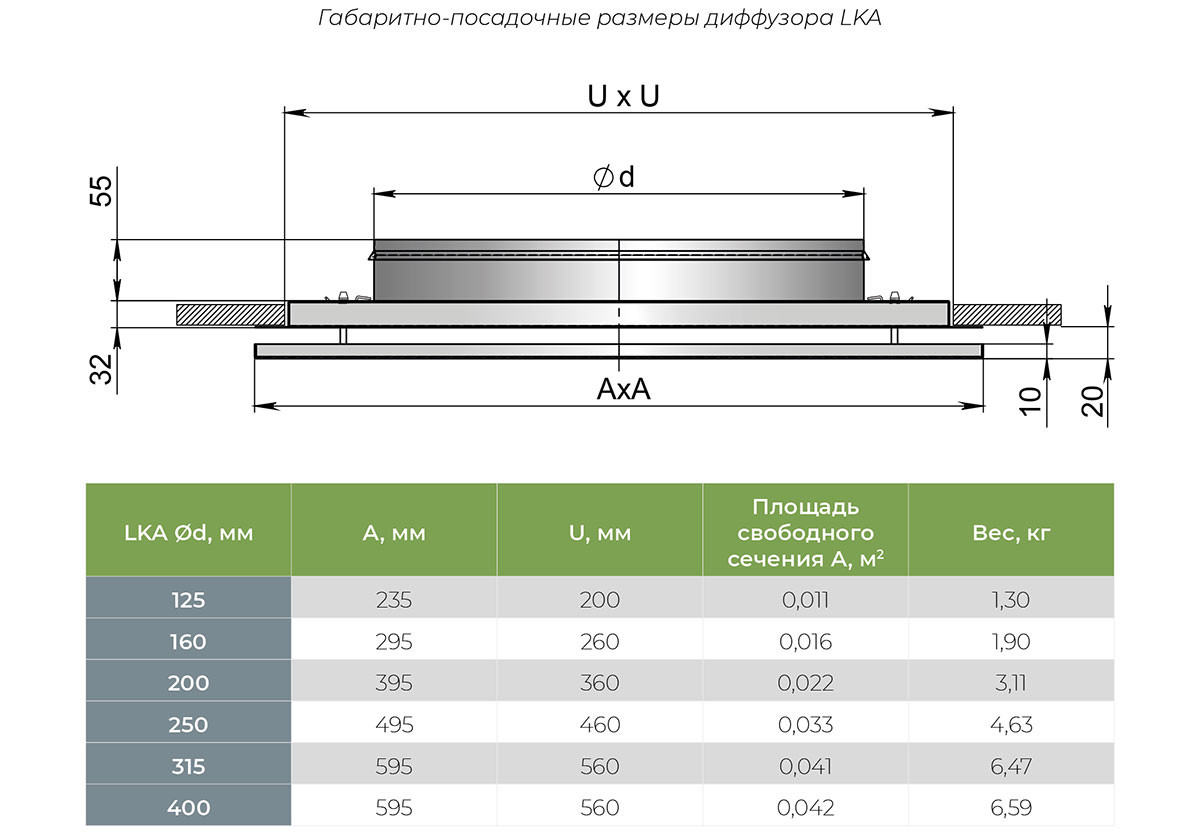 Диффузоры изготавливаются из оцинкованной листовой стали толщиной 0,9 мм и по умолчанию покрываются полимерной порошковой краской белого цвета RAL 9016M (матовая). Камера статического давления по умолчанию поставляется без покрытия. По запросу возможна окраска в любой цвет по международной шкале RAL как лицевой панели, так и камеры. Заказать камеру статического давления для диффузора LKA.