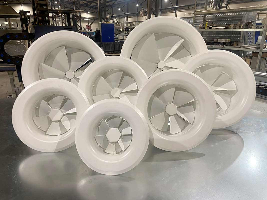 Диффузоры изготавливаются из стали и окрашиваются методом порошкового напыления в белый матовый цвет по умолчанию (RAL 9016М). По требованию возможна окраска в любой цвет по каталогу RAL.